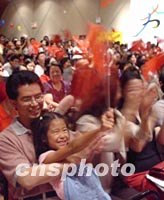 美東時間十三日晚上,八百多名紐約華人華僑和留學生代表參加中國駐紐約總領館舉行的招待會。他們揮舞手中的五星紅旗,慶祝北京獲得二○○八年奧運主辦權。中新社記者 陳建 攝