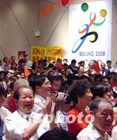 美東時間十三日晚上,八百多名紐約華人華僑和留學生代表參加中國駐紐約總領館舉行的招待會。他們熱烈鼓掌,慶祝北京獲得二○○八年奧運主辦權。中新社記者 陳建 攝