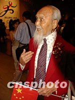 七月十三日北京獲得二○○八年奧運會主辦權。僑居紐約的九十五歲老人黃中孚先生手持五星紅旗,出席了中國駐紐約總領館舉行的慶祝招待會。他說:“北京主辦奧運會是我多年的心愿。”中新社記者 陳建 攝
