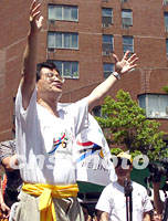 美東地區僑學界七月十五日在紐約華埠集會,歡慶北京申奧成功。當臺上的女歌唱家高歌《我愛你,中國》時,一位華裔女青年情不自禁地跟著吟唱起來。中新社記者 郭健 攝