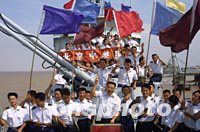 七月中旬駐上海橫沙島的海軍某部649艇官兵們,在甲板上歡呼慶祝北京申辦2008奧運會取得成功。中新社圖 張海峰 攝