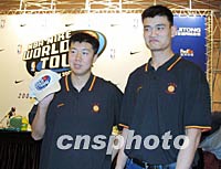 一場原汁原味的NBA比賽將于九月十六日首次在上海舉行。這場名為NBA NIKE星光大賽對賽的陣容是由NBA球星以及中國當地最佳球員混合組成。圖為王治郅、姚明在上海表示要盡力打好比賽。中新社記者 潘索菲 攝