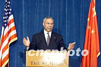 正在北京訪問的美國國務卿鮑威爾二十八日傍晚在他下榻的北京國際俱樂部飯店回答記者提問。中新社記者 毛建軍 攝