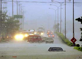 桃芝臺風造成臺灣46人死亡 當局解除陸上警報 2001年07月31日 10:08 ![]() 當局出動直升機救援被困民眾 ![]() 暴雨造成公路淹水,許多汽車在水中動彈不得。 中新網香港7月31日消息:桃芝臺風重創臺灣,截至臺灣有關當局今天上午8時30分統計,已經造成46人死亡、150人失蹤、32人受傷。目前已知至少花蓮還有37人失蹤、南投縣有87人失蹤、臺中縣有13人失蹤。由于失蹤多屬落水或被土石流淹沒,預估罹難人數可能還會大幅暴增。 另一方面,隨著桃芝臺風移向大陸,臺灣氣象局今天上午5時25分解除陸地臺風警報,海上警報不排除在中午以前解除。不過,今天臺灣西半部及東北部仍有機會出現豪雨,氣象局提醒民眾仍要多注意。 桃芝臺風雖然已經逐漸遠離,但是強勁雨勢,造成各地紛紛傳出災情,使得后續善后的工作無法完成,受創嚴重的南投縣政府及臺中縣和平鄉,已經做出31日停止上班上課的決定。 至于宣布照常上班上課的縣市則有:臺北縣、臺北市、臺中市、連江縣;彰化縣是正常上班、但是國中小停課,高中以上正常上課。 電信方面,至30日22時止,共有16790戶電話故障。用水部分,花蓮、臺東、嘉義、南投、苗栗、臺中縣市、高雄縣等地區,因豪雨致凈水場取水口遭土石淹沒,目前仍有478310戶停水。電力方面,全臺共有347581戶停電。 農牧損失12.45億元,當局將要求農產公司等單位緊急釋出7千公噸蔬菜,避免菜價狂飆。 東森新聞援引臺灣的消防署統計資料,近15年來造成嚴重災情的臺風分別是2000年象神臺風(64人死亡、25人失蹤、65人受傷);1996年賀伯臺風(51人死亡、22人死亡、463人受傷);1997年溫妮臺風(44人死亡、1人失蹤、84人受傷);1998年瑞伯臺風(28人死亡、10人失蹤、27人受傷)。 |
