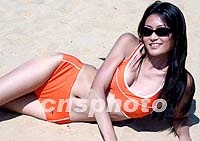 正在青島舉行的戴安娜2001世界精英模特大賽中國預選賽暨金沙灘模特大賽,十一日在金沙灘景區拍攝外景。圖為一名身穿泳裝的模特在沙灘上拍照。 中新社記者 錢興強 攝