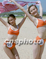 日前,參加戴安娜2001世界精英模特大賽中國預選賽暨金沙灘模特大賽的選手,在金沙灘進行外景拍攝。圖為兩名參賽女模特在沙灘上熱舞。中新社記者 錢興強 攝