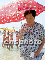 日前,在青島參加戴安娜2001世界精英模特大賽中國預選賽的模特選手,來到風景秀麗的金沙灘景區拍攝。圖為一位沙灘漫步的打傘老人匆匆從身穿泳裝模特身邊走過。中新社記者 錢興強 攝