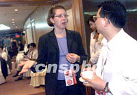 APEC2001年第三次高官會(huì)相關(guān)會(huì)議八月二十一日繼續(xù)在遼寧大連舉行,澳大利亞貿(mào)易官員白儒石接受記者采訪。中新社記者 滿(mǎn)會(huì)喬 攝