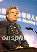 2001年亞太經(jīng)合組織女領(lǐng)導(dǎo)人會(huì)議二十二日在北京人民大會(huì)堂開(kāi)幕,中國(guó)全國(guó)人大常委會(huì)副委員長(zhǎng)、中華全國(guó)婦女聯(lián)合會(huì)主席彭珮云在會(huì)上致詞。中新社記者 毛建軍 攝