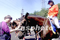 參加APEC2001年第三次高官會的部分與會代表二十二日在大連市參觀,一位女士親切地與大連女子騎警隊的馬兒交流。中新社記者 滿會喬 攝