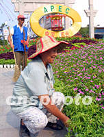 第八屆APEC財長會議近日在中國江蘇省蘇州市舉行,為歡迎各國會議代表的到來,蘇州市在大街小巷擺放了七十六萬盆鮮花裝點市容,這是蘇州市觀前街路口的花壇前,清潔工人正在護理擺放的鮮花。中新社記者 李剛 攝