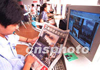 十一日發生的美國受襲“爆炸事件”引起北京大學生關注,十二日中午北京大學附近近千臺電腦的網吧內座無虛席,一名學生邊瀏覽網頁,邊翻閱報刊,全面關注此次“爆炸事件”。中新社圖 張宇 攝