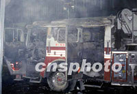 美國“九一一”劫難發生后,大批消防車開赴世貿中心附近搶險,被從天而降的碎石、爛鐵砸壞,二百多名消防員失蹤。中新社圖