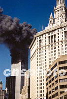 圖:美世貿(mào)中心被撞擊之后(資料圖片)