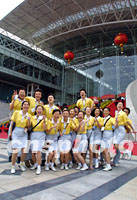 為期三天的第六屆世界華商大會十九日將在南京謝幕時,忙碌了數天的志愿者抽空在主會場前合影留念。中新社記者 鄭萍萍 攝