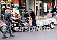遭“九一一”恐怖襲擊后的紐約,警力不敷調配,請外州警察支援,街頭出現不同制服的警察同時執勤。圖為他們默契配合截停一輛帶拖斗而試圖南行的嶄新摩托車,進行安檢。中新社圖 龔文謨 攝