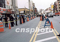 紐約華埠交通恢復,但為確保到“九一一”爆炸現場的急救車輛暢通無阻,當局在華埠南北向主要街道之一的包厘街中央劃出一條通道,由警察嚴密把守,只準經驗證的各種急救車通過。中新社圖 龔文謨 攝