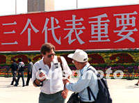 十·一前夕,外國游客在北京天安門廣場游覽。在他們身后是為慶祝中國建國五十二周年而掛起的“認真學習全面貫徹三個代表重要思想”的橫幅。中新社圖 張宇 攝