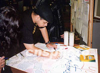 紐約市立大學(xué)亨特學(xué)院的學(xué)生領(lǐng)袖提出一個口號:“我們只需要和平。”許多學(xué)生在簽名表示支持。中新社圖