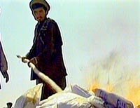 在美國大兵壓境的背景下,阿富汗北方聯盟和塔利班之間的內戰日前更趨激烈。圖為北方聯盟士兵在焚燒從塔利班控制地區內搜獲的海洛因,海洛因據稱是拉登恐怖組織重要的資金來源。