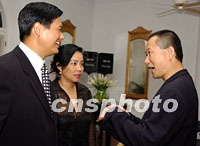 專程到澳門出席 "第十五屆澳門國際音樂節"臥虎藏龍音樂會的香港巨星周潤發和夫人,4日與奧斯卡金像獎得主、著名指揮家譚盾在澳門喜相逢。中新社圖 任晨鳴 攝