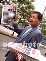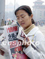 “‘中國出線!美國開戰!’看報!”,北京報刊八日清晨刊登了中國足球出線世界杯勝況,和美國反擊塔利班的戰事,街頭報販為此大聲叫賣。中新社記者 鄒憲 攝