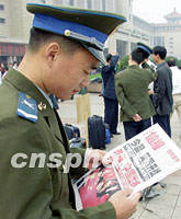 北京新聞媒體八日晨及時報道有關美國對阿富汗開戰消息。在北京火車站,一名空軍士兵正在認真閱讀美阿戰事新聞。中新社記者 錢興強 攝