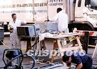 在紐約世界貿易中心附近封鎖的馬路上,工人們正在清洗嵌滿爆炸粉塵的窗式空調機。中新社記者 龔文謨 攝