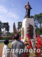 廣東各地紛紛舉行辛亥革命九十周年紀念活動,在韶關市中山公園內孫中山先生銅像前,擺滿各界人士敬獻的花籃,一對老年夫婦遠道而來瞻仰歷史偉人孫中山先生銅像。七十多年前,孫中山先生曾兩次親臨韶關,在中山公園所在地督師北伐。中新社圖 馮昶 攝