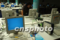 11日,技術(shù)人員正在上海國(guó)際新聞中心安裝寬帶網(wǎng),為十月APEC采訪的記者提供快捷的服務(wù)。中新社記者 賈國(guó)榮 攝