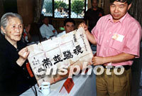 辛亥革命老人、孫中山先生秘書黃展云的女兒黃以雍,十一日以九十三歲的高齡專程赴長樂市,為其父于一九二七年創辦的“營前模范村”后人林泉送上父親當年親筆提寫的匾額。中新社圖 陳勇 攝