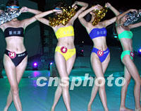 由海南省三亞市人民政府和新絲路模特經紀有限公司主辦的“2001新絲路中國模特大賽總決賽”十三日在三亞進行。圖為身穿泳裝的女模特手舞花環盡情歡跳。中新社記者 錢興強 攝