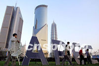 本屆APEC會議的新聞發(fā)布廳設置在上海東方明珠大廈,新的APEC霓紅標識十三日正在大廈前的廣場草坪上進行裝備,它的背景是上海浦東的經(jīng)典建筑:金茂大廈、中銀大廈、中保大廈。中新社圖 劉殊瑾 攝