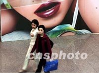 上海一家名牌商店里的巨幅廣告畫與走過的顧客相映成趣。即將在這里舉行的APEC高峰會為上海帶來新的商機,滬上各商家紛紛推出各種促銷手段吸引顧客。中新社記者 毛建軍 攝