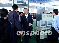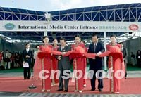設在上海明珠塔下的APEC新聞中心十四日上午正式開始運作,中國外交部副部長王光亞(前左二),上海市副市長周慕堯為啟用儀式剪彩。中新社記者 毛建軍 攝