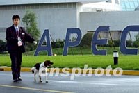 上海警方出動警犬在APEC會議國際新聞中心巡邏,全球三千記者十四日開始進入清晨啟用的新聞工作區。中新社記者 賈國榮 攝