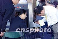 上海APEC會議的國際新聞中心十月十四日清晨啟用,出席剪彩儀式的中國新聞官們通過安全檢查門進入辦公室。中新社記者 賈國榮 攝