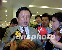 中國外交部新聞司司長朱邦造十五日在上海被采訪APEC的港臺(tái)記者團(tuán)團(tuán)圍住,他在闡述臺(tái)灣問題時(shí)表示,只要在一個(gè)中國的前提下,任何問題都可以商談。中新社記者 潘索菲 攝