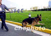 在上海東方明珠大廈的廣場綠地上,警方防暴犬正在值班,以加強APEC會議的治安工作。中新社圖 劉殊瑾 攝