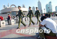 在上海博物館廣場,一隊(duì)武裝警察上海博物館巡邏而過,路旁一對小情侶正在熱戀之中。APEC會議的嘉賓十月中旬將在這里參觀中國文物。中新社記者 賈國榮 攝