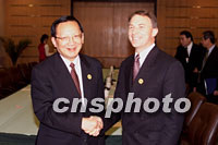 中國外交部長唐家璇十六日在上海國際會議中心會見前來參加亞太經合組織(APEC)會議的新西蘭外交、貿易和司法部長菲利普·布魯斯·戈夫。中新社記者 毛建軍 攝