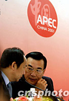 中國臺北代表林信義和陳博志先生十六日在上海APEC國際新聞中心舉行發布會。中新社記者 賈國榮 攝