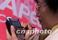 采訪上海APEC的各國記者全副武裝,各種最先進的拍攝、傳輸技術也紛紛登臺亮相,一位女記者用目前世界最小的康柏掌上電腦在新聞現場傳輸圖片。中新社記者 毛建軍 攝