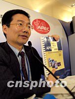 日本政府官員松永大介十七日在上海國際新聞中心手持《大阪行動計劃書》,向記者介紹APEC的日本策略,日本現已制定了一系列進行“人力資源培養”的計劃。中新社圖 劉殊瑾 攝