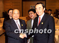中國對外經濟貿易合作部長石廣生十七日在上海國際會議中心會見前來參加2001年亞太經合組織(APEC)會議的日本經濟產業大臣平沼赳夫。中新社記者 毛建軍 攝