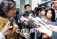 參加APEC雙部長會議的馬來西亞貿易部長拉菲達·阿齊茲,十八日剛剛走出上海國際會議中心就被記者團團包圍。中新社圖 劉殊瑾 攝