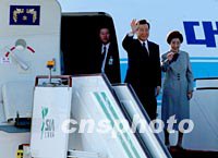 韓國總統(tǒng)金大中和夫人乘坐專機(jī)十八日下午抵達(dá)上海浦東國際機(jī)場(chǎng),出席APEC峰會(huì)。中新社記者 賈國榮 攝