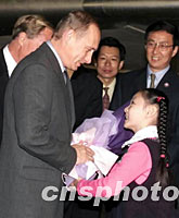 10月18日,前來參加亞太經合組織領導人非正式會議的俄羅斯總統弗拉基米爾·普京抵達上海。這是普京總統下飛機后接受中國兒童獻花。中新社圖