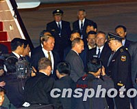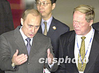 10月18日,前來參加亞太經合組織領導人非正式會議的俄羅斯總統弗拉基米爾·普京抵達上海。這是普京和到機場迎接的俄羅斯駐華大使羅高壽交談。中新社圖