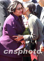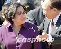 印度尼西亞總統梅加瓦蒂(左)十九日中午到達上海浦東機場,她將參加二十一日的APEC領導人非正式會議。中新社圖 劉殊瑾 攝